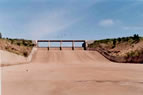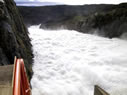 El canal de fuga está revestido en hormigón y tiene una longitud de 428 m y ancho variable entre 75,4 y 45 m