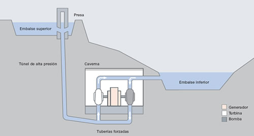Las centrales de bombeo impulsan el agua de un embalse inferior a otro superior. Esto ocurre normalmente durante la noche, cuando la capacidad para generar electricidad se usa para operar las bombas.