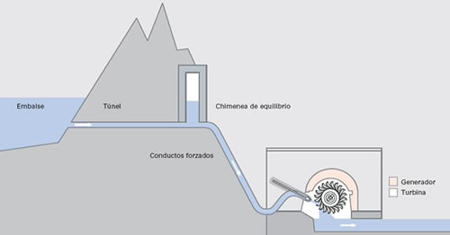 El agua fluye a través de unos túneles o tuberías hasta alcanzar las tuberías de la central ubicada en el valle.