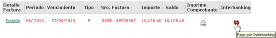 Podrá acceder desde su "Estado de cuenta" en nuestro sitio web, donde se visualiza el ícono de interbanking acompañando a la factura pendiente de pago y NO vencida como puede ver en la siguiente imágen: