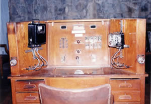 con una colección de medidores o contadores para corriente contínua y alternada, monofásicos y trifásicos, de medición directa e indirecta, equipos de medición y un equipo de contraste montado en un bello escritorio de madera.